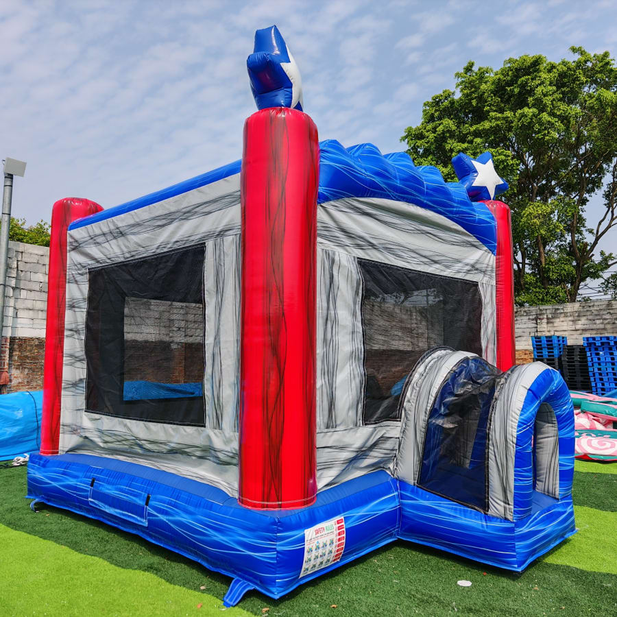 Measuring a generous 13’L x 13’W x 13’H, the Star Spangled Castle provides plenty of bouncing room for multiple kids to jump, laugh, and play together. This bounce house also includes an exciting basketball hoop inside, adding a sporty twist and even more entertainment for energetic partygoers. Built for dry use only, it's perfect for indoor or outdoor setups, ensuring a clean and comfortable play environment.