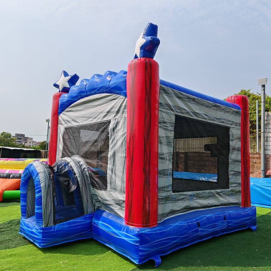 Measuring a generous 13’L x 13’W x 13’H, the Star Spangled Castle provides plenty of bouncing room for multiple kids to jump, laugh, and play together. This bounce house also includes an exciting basketball hoop inside, adding a sporty twist and even more entertainment for energetic partygoers. Built for dry use only, it's perfect for indoor or outdoor setups, ensuring a clean and comfortable play environment.